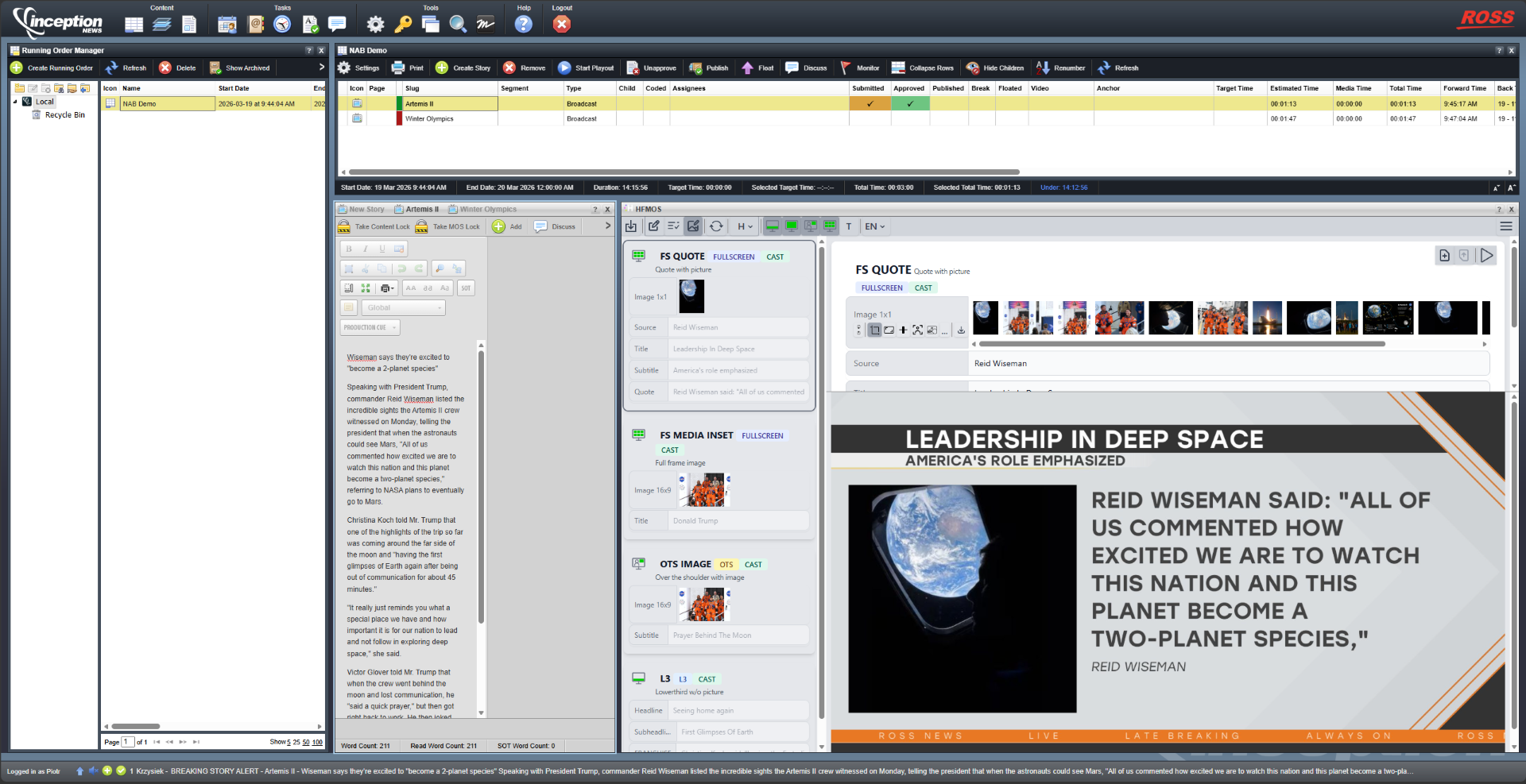 HighField AI analyzes story context within Ross Inception, identifies the appropriate Ross XPression graphics templates, and assists in generating production-ready graphics by assembling relevant content, including text, quotes, visuals, and data, while applying editorial and branding rules. Content assets can be retrieved through Ross Streamline, with graphics rendered and deployed through XPression.